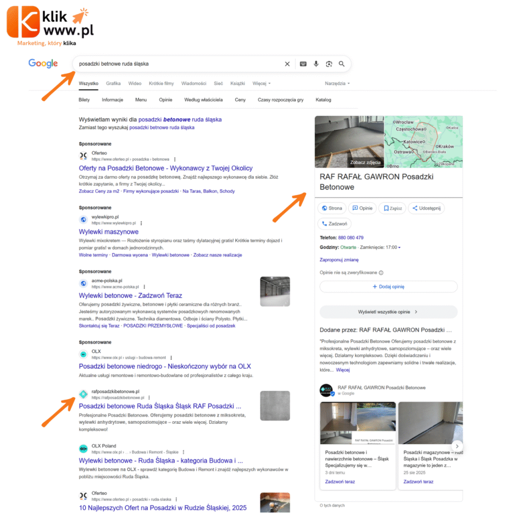 Przykład: Dla klienta z branży posadzki betonowe w miejscowości Ruda Śląska stworzyliśmy stronę nastawioną na pozyskiwanie zapytań. Po 3 miesiącach liczba kontaktów wzrosła o 60%.